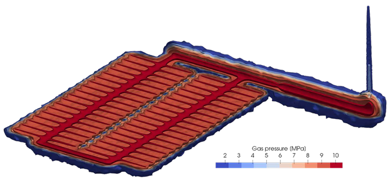 In this paper, we present the results of a large-scale numerical model of a generic nuclear waste repository situated in an argillaceous host rock formation. Modelling the evolution of an entire repository presents challenges due to the strong contrast in spatial and temporal scales at which the different processes take place, ranging from the centimetres to the kilometres and days to hundreds of thousands of years, respectively. From the view point of the physical processes, a further challenge originates from the different gas transport mechanisms: Gas advection as well as gas dissolution and diffusion jointly govern the efflux of gas from the repository and mitigate excess pore pressures, but there is a significant contrast between the rates of these two transport mechanisms. Using the TH2M implementation in the open-source finite element code OpenGeoSys-6 , we analyse the impact of gas transport via advection (in the partially saturated zones such as backfilled drifts, shafts and desaturated host rock) as well as gas transport via diffusion (in fully water-saturated media such as the undisturbed host rock and over- and underlying formations). Finally, this work outlines and discusses possible simplifications in modelling choices, such as mechanical surrogate models, geometrical simplifications as well as the impact of discretization. The work presented in this paper was carried out within the scope of the European Joint Programme EURAD, workpackage Gas, Task 4. In dieser Arbeit präsentieren wir die Ergebnisse eines großskaligen numerischen Modells eines generischen Endlagers für radioaktive Abfälle in einer tonigen Wirtsgesteinsformation. Die Modellierung der Entwicklung eines gesamten Endlagers stellt aufgrund der starken Kontraste in den räumlichen und zeitlichen Skalen, auf denen die verschiedenen Prozesse ablaufen, eine Herausforderung dar. Diese reichen von Zentimetern bis zu Kilometern sowie von Tagen bis zu mehreren hunderttausend Jahren. Aus Sicht der physikalischen Prozesse ergibt sich eine weitere Herausforderung aus den unterschiedlichen Gastransportmechanismen: Gasadvektion sowie Gaslösung und Diffusion bestimmen gemeinsam den Austrag von Gas aus dem Endlager und tragen zur Reduzierung überschüssiger Porendrücke bei, wobei jedoch ein erheblicher Unterschied zwischen den Transportgeschwindigkeiten dieser beiden Mechanismen besteht. Unter Verwendung der TH2M-Implementierung im Open-Source-Finite-Element-Code OpenGeoSys-6 analysieren wir den Einfluss des Gastransports durch Advektion (in teilweise gesättigten Zonen wie verfüllten Strecken, Schächten und desaturiertem Wirtsgestein) sowie des Gastransports durch Diffusion (in vollständig wassergesättigten Medien wie dem ungestörten Wirtsgestein sowie den über- und unterlagernden Formationen). Abschließend werden mögliche Vereinfachungen bei Modellierungsentscheidungen skizziert und diskutiert, darunter mechanische Ersatzmodelle, geometrische Vereinfachungen sowie der Einfluss der Diskretisierung. Die in dieser Arbeit vorgestellten Untersuchungen wurden im Rahmen des European Joint Programme EURAD im Arbeitspaket Gas, Task 4 durchgeführt.