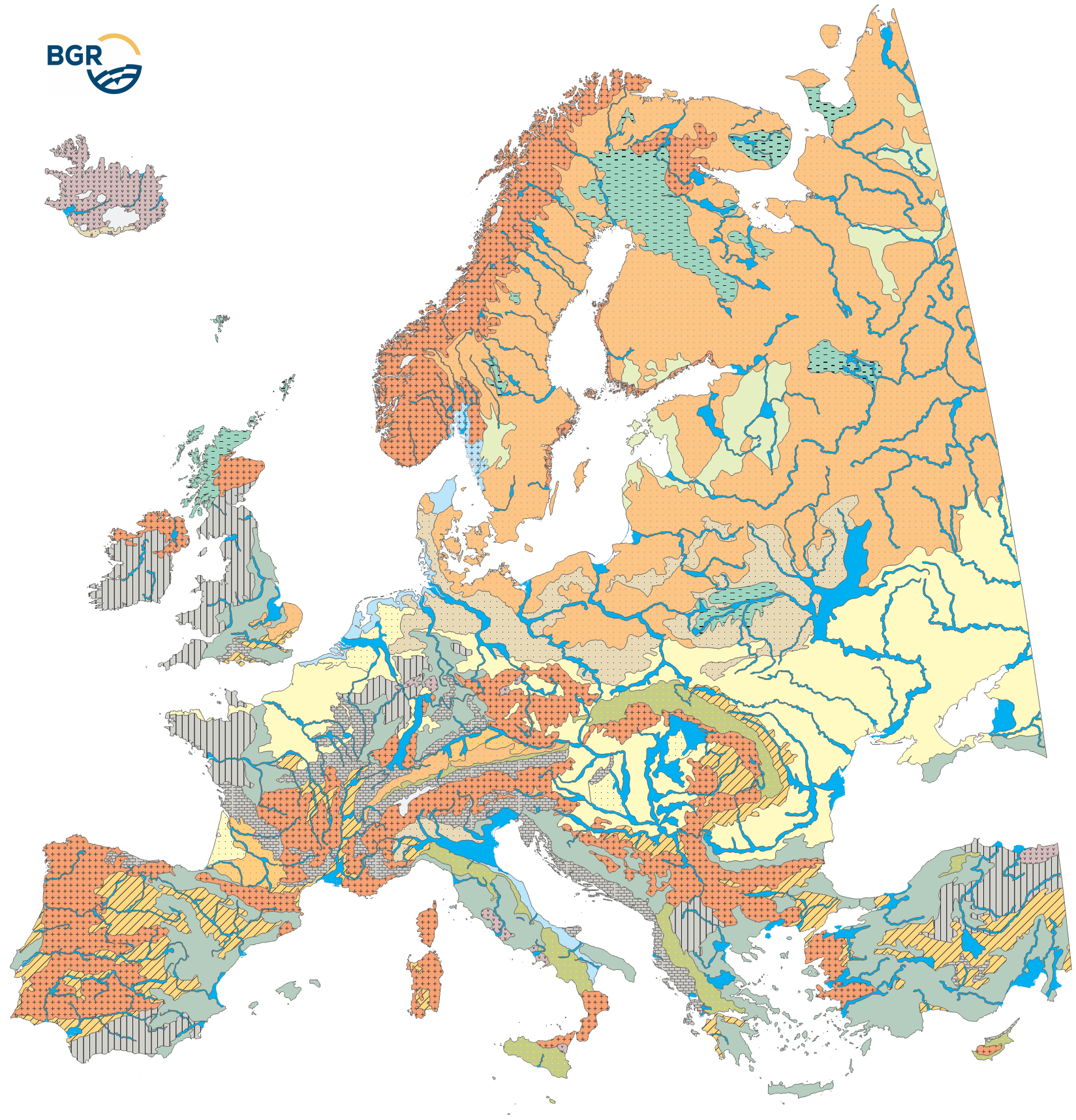 For the legend-building of the soil regions map (EUSR5000), areas with similar climate (EUCA15000) are further subdivided into areas with similar parent material, thus with a similar geologic paleogeographic development. Because the geological conditions (nature of parent material) are key factors for soil formation, it must be characterized at the level of the soil regions as well. In order to represent parent material at the Europe-wide continental level, data from small-scale geological maps were re-interpreted and aggregated to parent material associations 1:15 Mio. The different rocks are summarized by geological formation, at the same time following the main class- or group-level from the List of Parent Material according to Finke et al.(2001). As a result, 18 rock complexes were received and evaluated in respect of their effect on soil formation. Here it must be pointed out that soils are not formed on the rock itself but on weathering products mostly consisting of several layers and with numerous external components incorporated by redeposition. Für die Legendenerstellung der der Karte der Bodenregionen (EUSR5000) werden Gebiete mit ähnlichem Klima (EUCA15000) weiter unterteilt in Gebiete mit ähnlichem Ausgangsmaterial und somit mit einer ähnlichen geologischen paläogeografischen Entwicklung. Da die geologischen Bedingungen (Beschaffenheit des Ausgangsmaterials) entscheidende Faktoren für die Bodenbildung sind, müssen sie auch auf der Ebene der Bodenregionen charakterisiert werden. Um das Ausgangsmaterial auf europäischer Kontinentalebene darzustellen, wurden Daten aus kleinmaßstäbigen geologischen Karten neu interpretiert und zu Ausgangsmaterialassoziationen im Maßstab 1:15 Mio. zusammengefasst. Die verschiedenen Gesteine werden nach geologischen Formationen zusammengefasst, wobei gleichzeitig die Hauptklassen- oder Gruppenebene aus der Liste der Ausgangsmaterialien nach Finke et al. (2001) berücksichtigt wird. Im Ergebnis wurden 18 Gesteinskomplexe erhalten und hinsichtlich ihres Einflusses auf die Bodenbildung bewertet. Dabei ist zu beachten, dass Böden nicht auf dem Gestein selbst entstehen, sondern auf Verwitterungsprodukten, die meist aus mehreren Schichten bestehen und zahlreiche durch Umlagerung eingebrachte Fremdkomponenten enthalten.